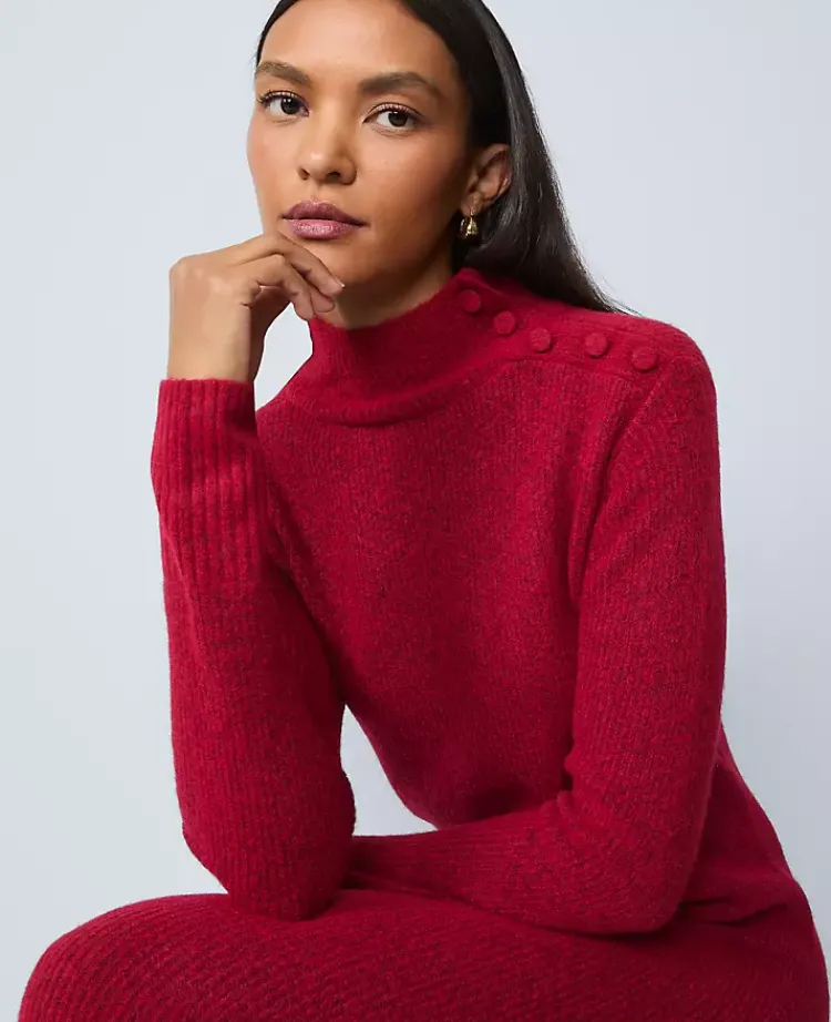 Discover Ann Taylor Weekend. Effortlessly polished pieces for wherever your plans take you. Button detailing along the shoulder punctuates this versatile ribbed sweater dress with the perfect fini finishing touch. Turtleneck. Long sleeves. Side button closures.
