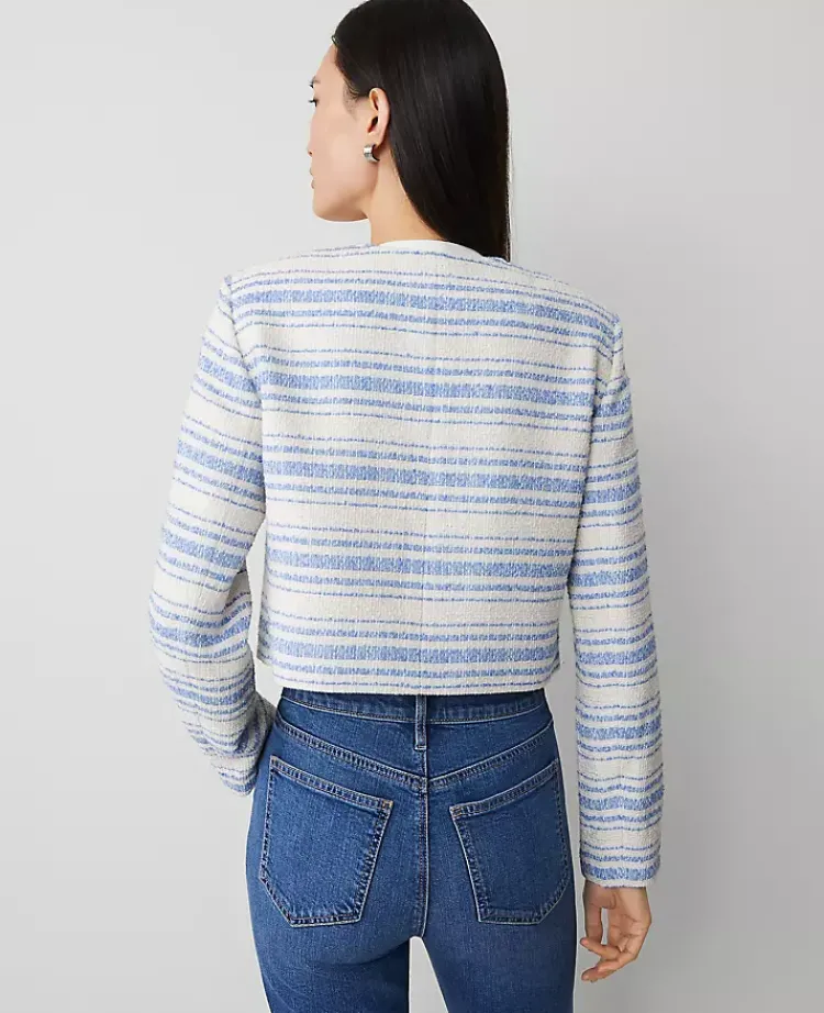 Ann Taylor Jackets And Blazers|Petite Jackets And Blazers|Petite Striped Tweed Cropped Jacket Light Blue/White Combo