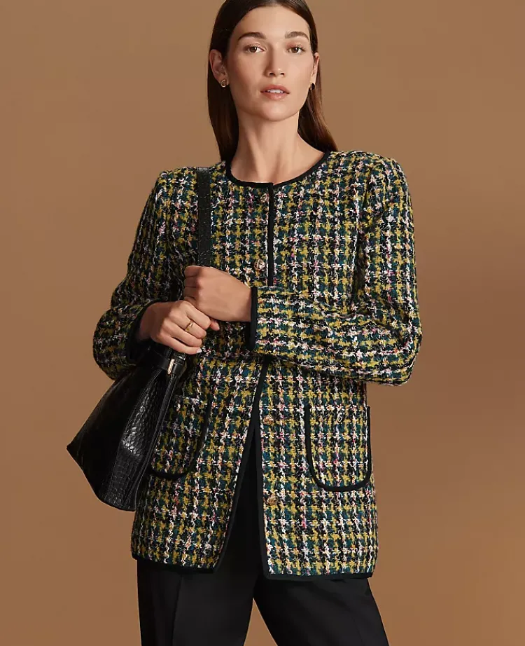 Ann Taylor Jackets And Blazers|Petite Jackets And Blazers|The Petite Long Crew Neck Jacket In Houndstooth Tweed Green/Navy Multi