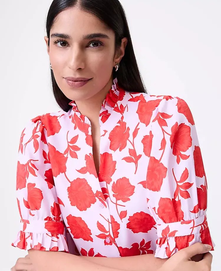Ann Taylor New Petite Styles|Petite Floral Ruffle Collar Shirt Fiery Sunset