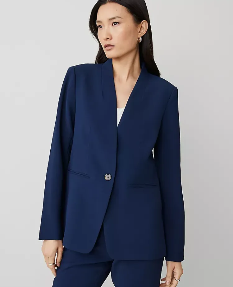Ann Taylor Petite Jackets And Blazers|Petite Suits|The Petite Long Collarless Blazer In Fluid Crepe Pure Sapphire