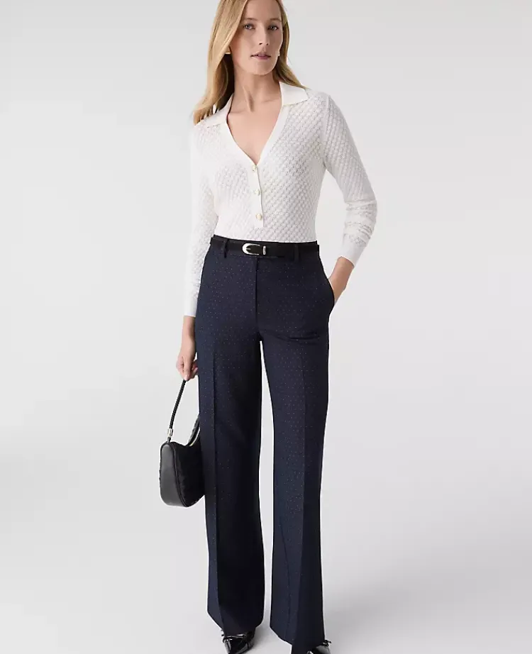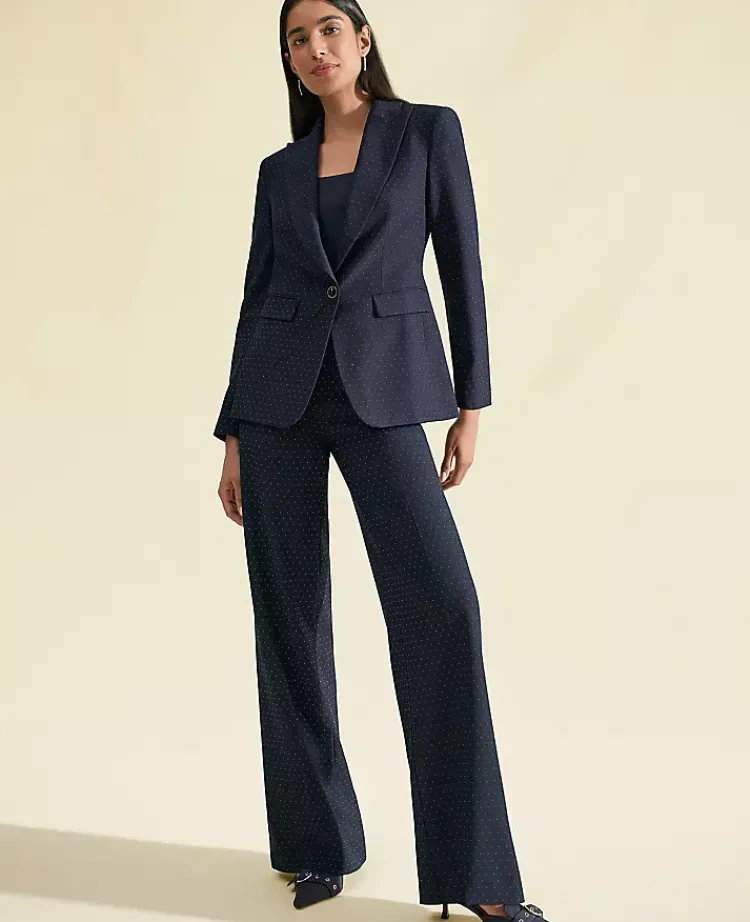 Ann Taylor Petite Pants|Petite Suits|The Petite Dotted Wide-Leg Flare Trouser Navy Woven Pin Dot