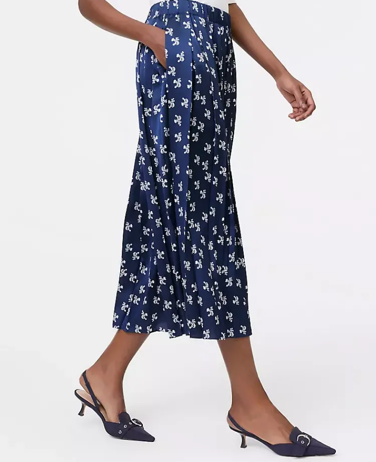 Ann Taylor Petite Skirts|New Petite Styles|Petite Floral Satin Pleated Midi Skirt Indigo Dusk