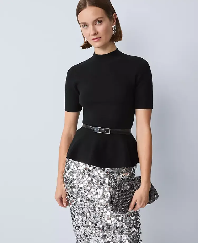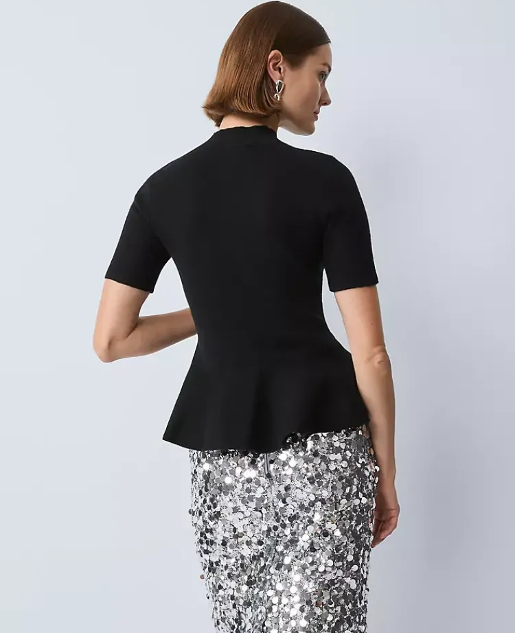 Ann Taylor Petite Sweaters|Petite Mock Neck Peplum Top Black