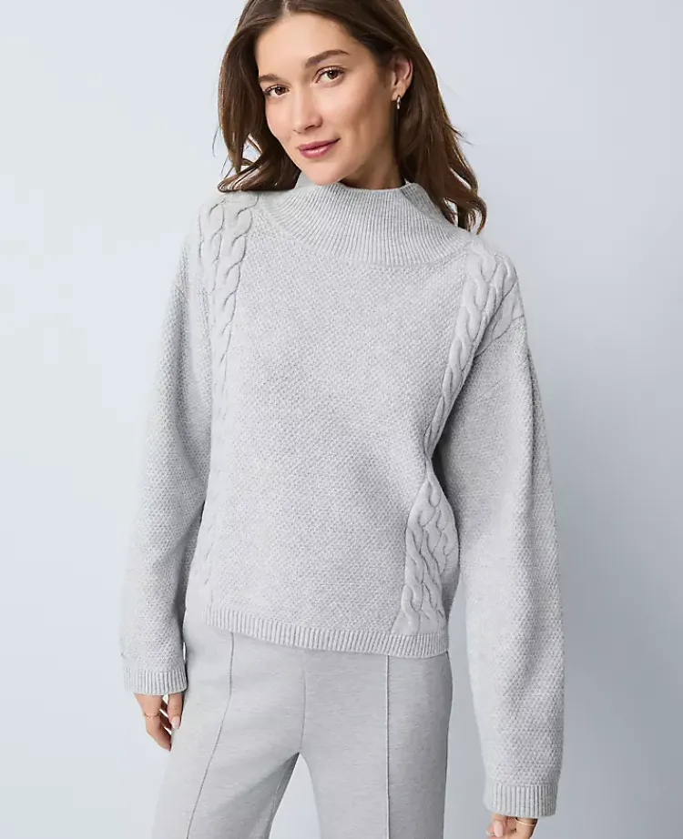 Discover Ann Taylor Weekend. Effortlessly polished pieces for wherever your plans take you. Done in a cozy mixed cable knit, this relaxed sweater is the quintessential wear-with-anything style. Ribbed mock neck, cuffs, and hem. Long sleeves. Drop shoulders.