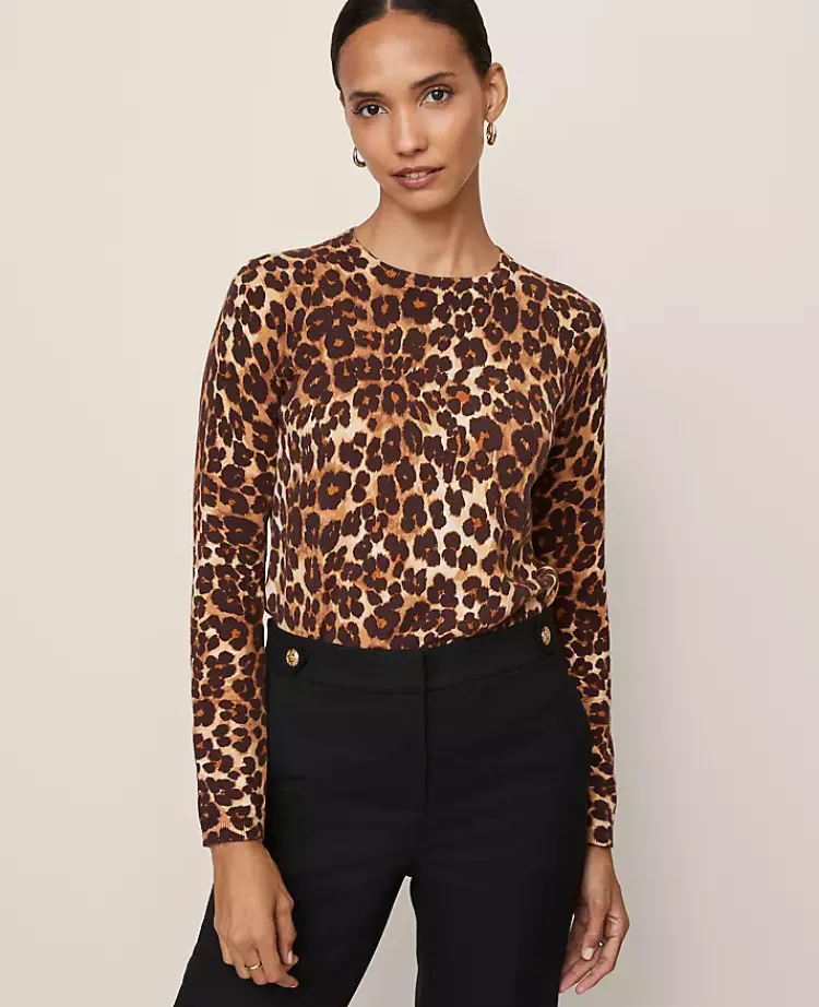 Ann Taylor Sweaters|All Sweaters|Petite Animal Print Essential Crew Neck Sweater Brown
