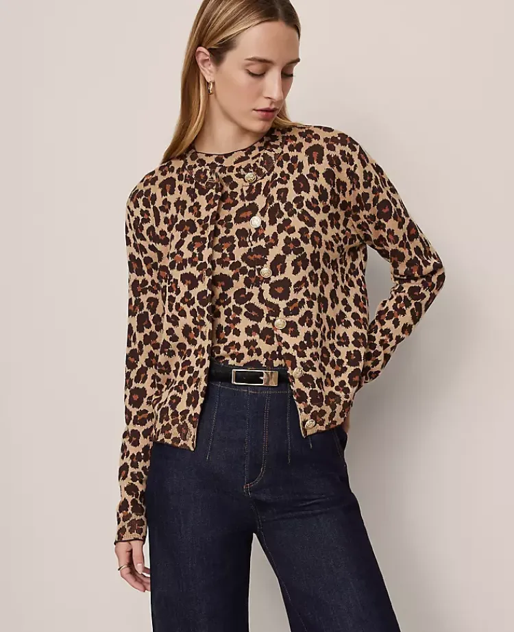 Ann Taylor Sweaters|All Sweaters|Petite Animal Print Jacquard Cardigan Almond Croissant