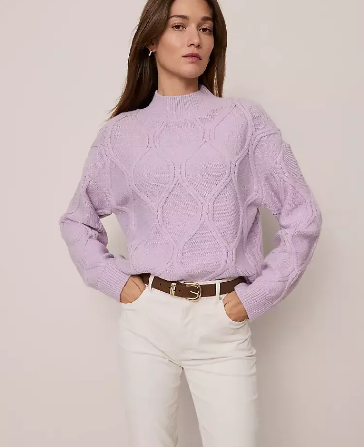 Discover Ann Taylor Weekend. Effortlessly polished, lived-in looks for wherever your plans take you. Cozy up with this plush sweater, featuring a chic and timeless diamond cable pattern. Mock neck. Long sleeves. Dropped shoulders.