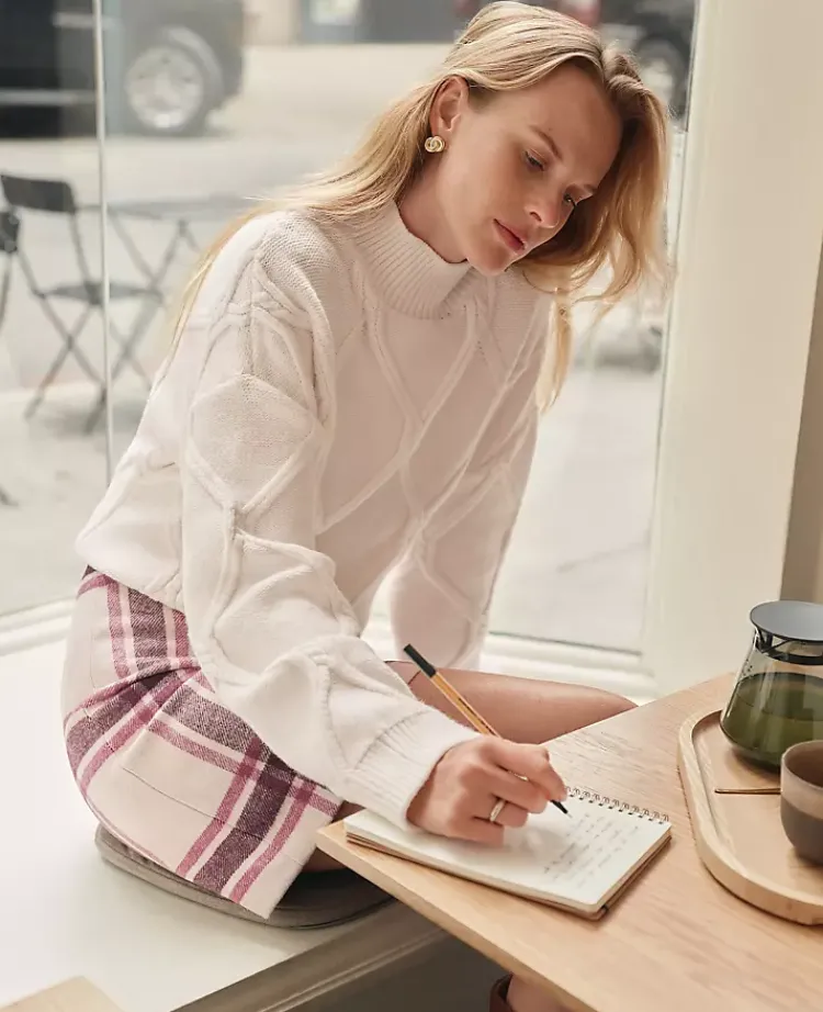 Discover Ann Taylor Weekend. Effortlessly polished, lived-in looks for wherever your plans take you. Cozy up with this plush sweater, featuring a chic and timeless diamond cable pattern. Mock neck. Long sleeves. Dropped shoulders.