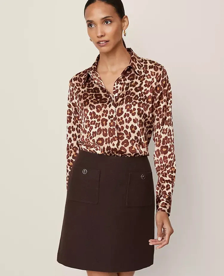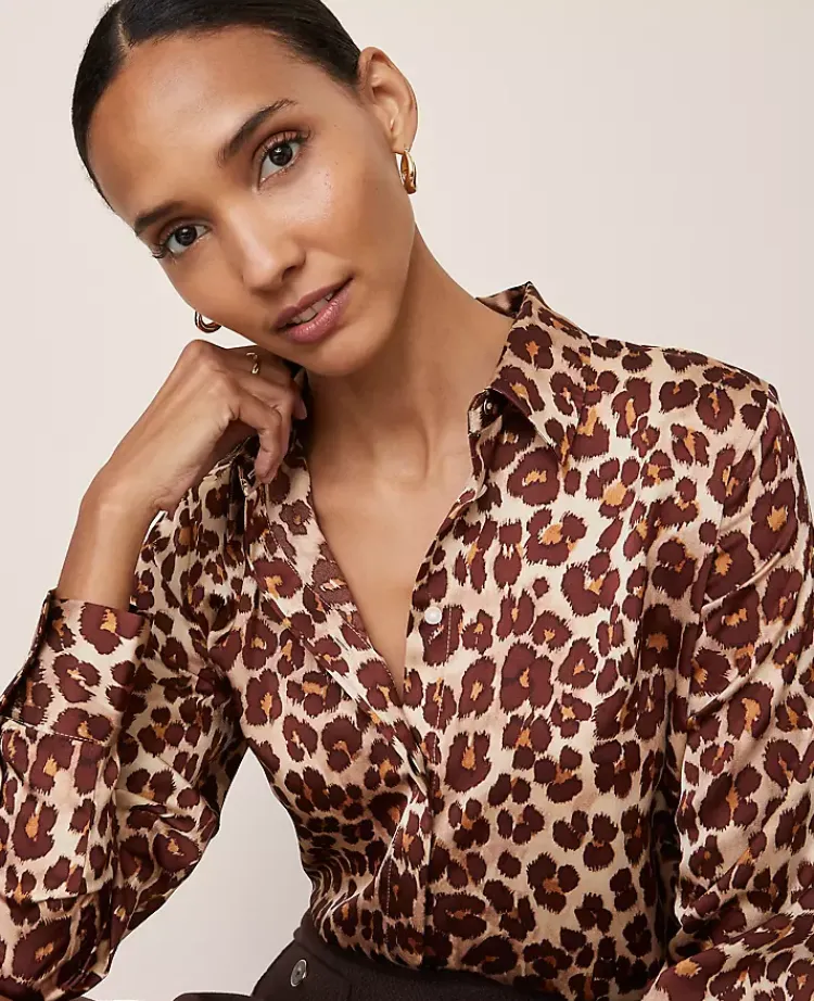 Ann Taylor Tops And Blouses|Animal Print Satin Button Down Shirt Pale Sandalwood