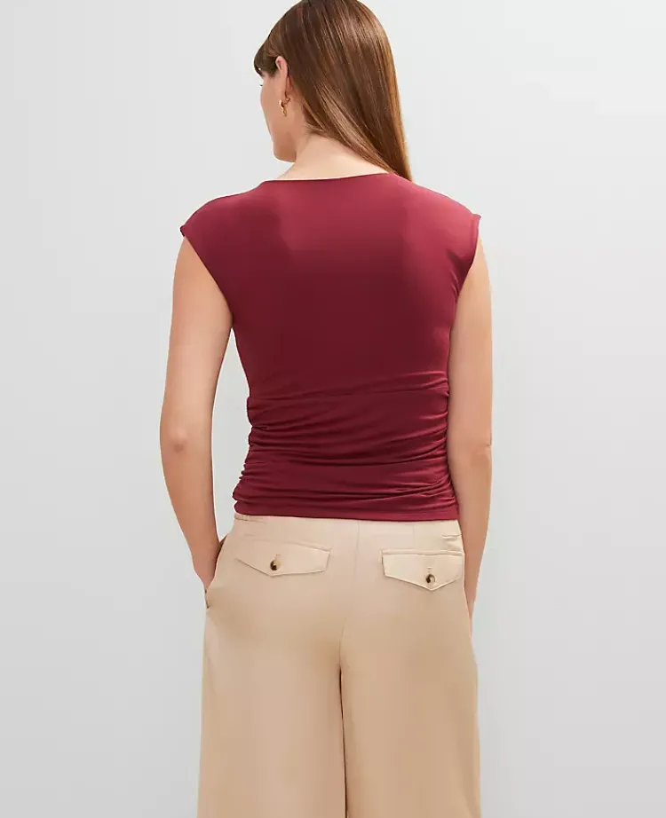 Artful gathered detailing and a crossover silhouette add an elegant touch to this wardrobe essential. V-neck. Sleeveless. Lined.