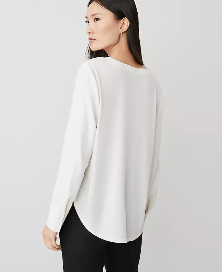 A clever pleated front adds extra ease and fluidity to this knit and woven essential. V-neck with pleat beneath. Long sleeves with button cuffs. Shirttail hem. Woven front and sleeves. Knit back.