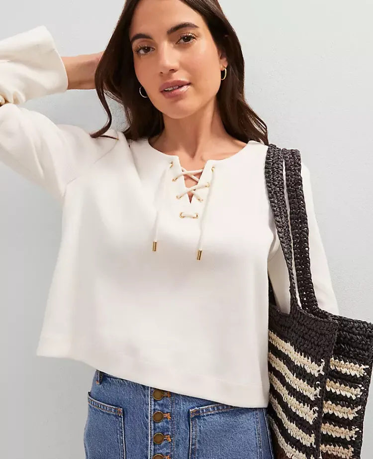 Discover Ann Taylor Weekend. Effortlessly polished pieces for wherever your plans take you. A lace-up neckline and drop shoulders lend modern attitude to this cropped, swingy top. Round neck with lace-up placket. Drop shoulders. Long sleeves.