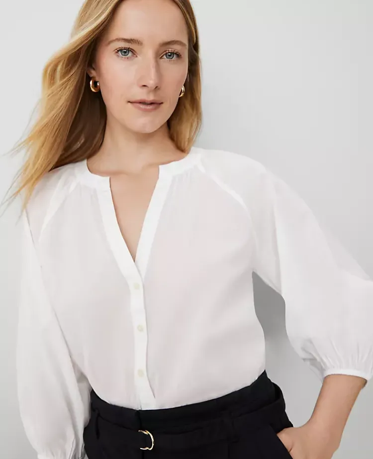 Discover Ann Taylor Weekend. Effortlessly polished pieces for wherever your plans take you. With blouson, raglan sleeves, this lean popover is a wear-with-everything touch of feminine style. Split neck with tab collar. Front-button closures. 3/4 sleeves with elasticized cuffs. Hi-low shirttail hem.