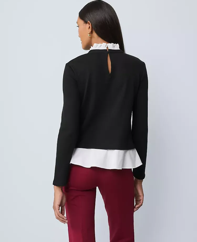 Discover Ann Taylor Weekend. Effortlessly polished pieces for wherever your plans take you. Pairing a polished knit top with a ruffled underlayer, this top is at the top of our list of must-haves. Crew neck ruffled collar. Long sleeves. Peplum hem.