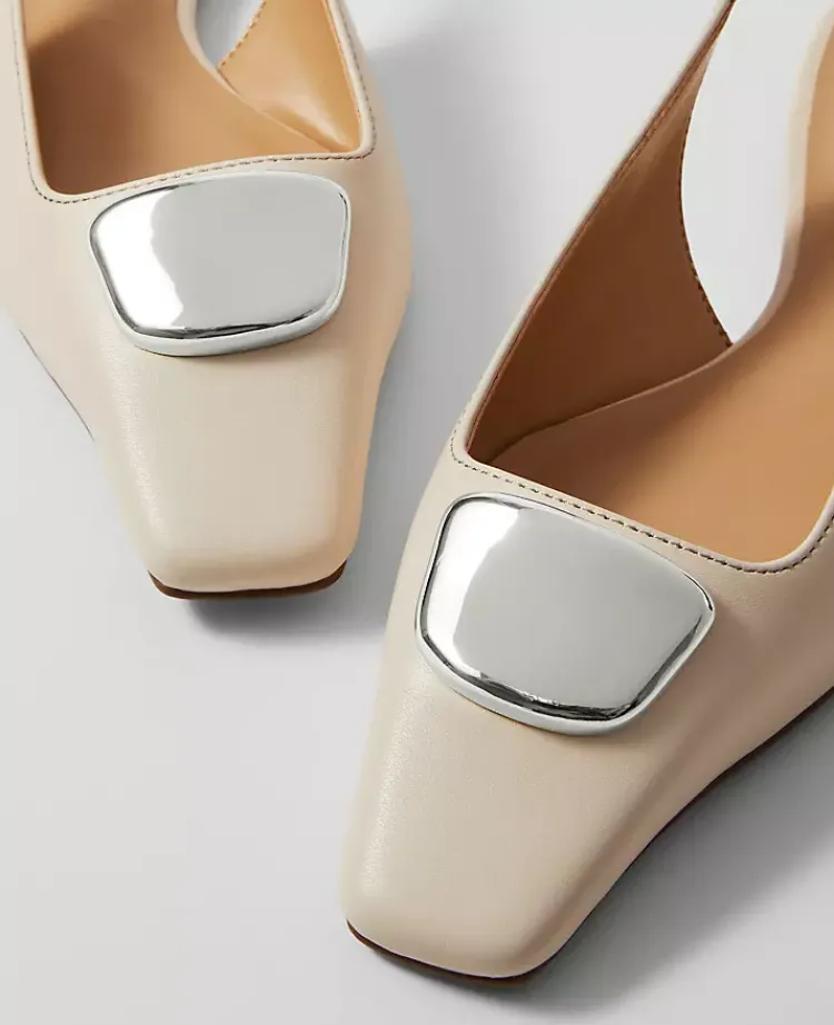 Ann Taylor Weekend Shoes|Weekend Shoes|Weekend Collection Hardware Embellished Leather Slingback Flat Cream Beige