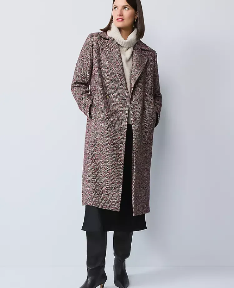 Ann Taylor Jackets And Blazers|Herringbone Double Breasted Long Coat Red/Purple Multi