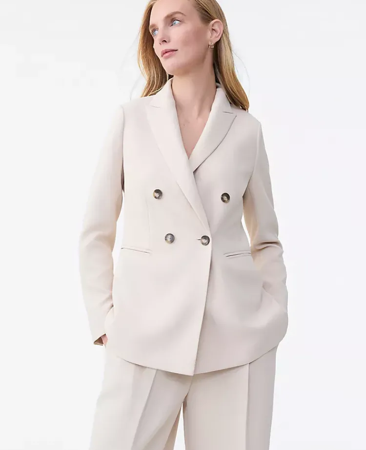In luxuriously rich textured drape fabric, we love this modern update on the classic double-breasted style — with a more tailored fit that always looks pulled together. Notched lapels. Double-breasted button front. Long sleeves with button cuffs. Front flap besom pockets. Back vent. Lined.