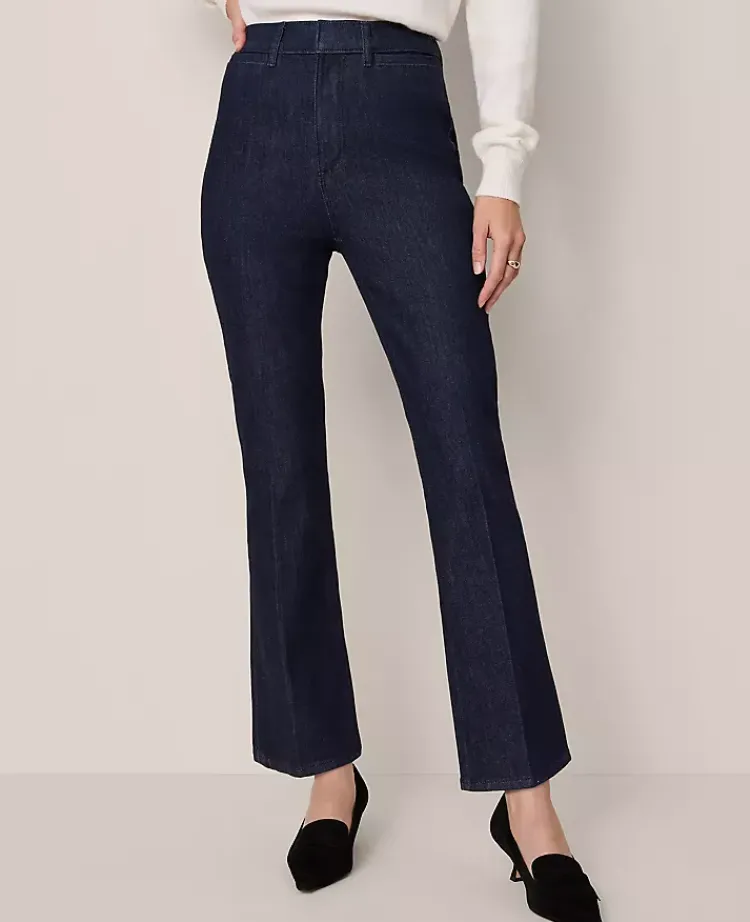 Designed with elongating pressed creases, our boot cut jeans are made from performance stretch denim that sculpts, shapes and supports all day long. Front zip with a hook-and-bar closure. Belt loops. Front and back welt pockets.