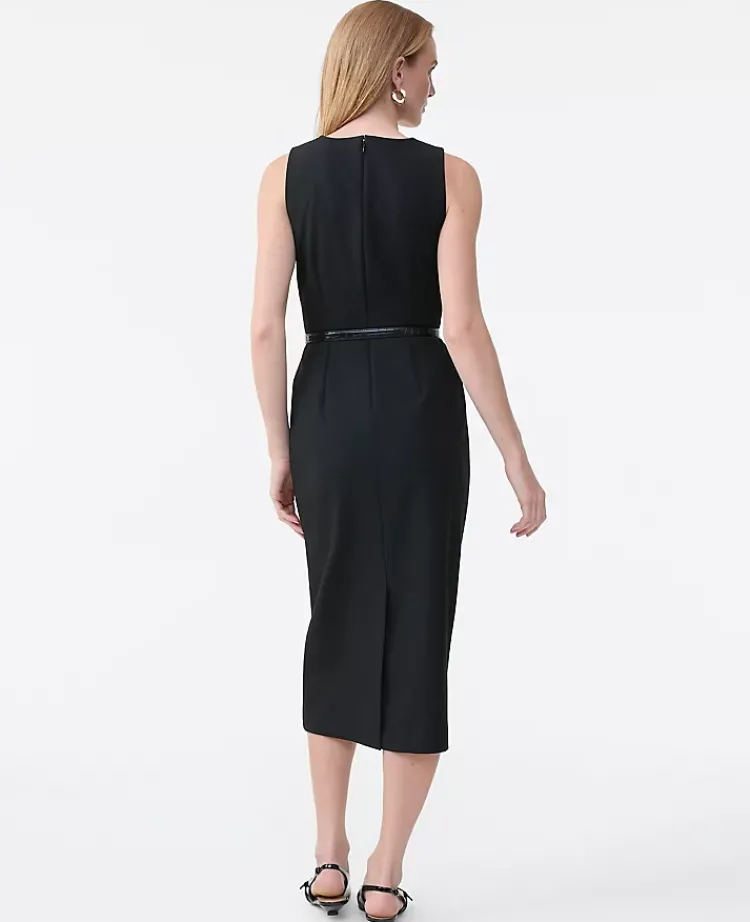 This chic and refined belted sheath is a go-to you’ll wear all season long. Crew neck. Sleeveless. Adjustable-buckle belt. Hidden back zip with hook-and-eye closure. Lined.