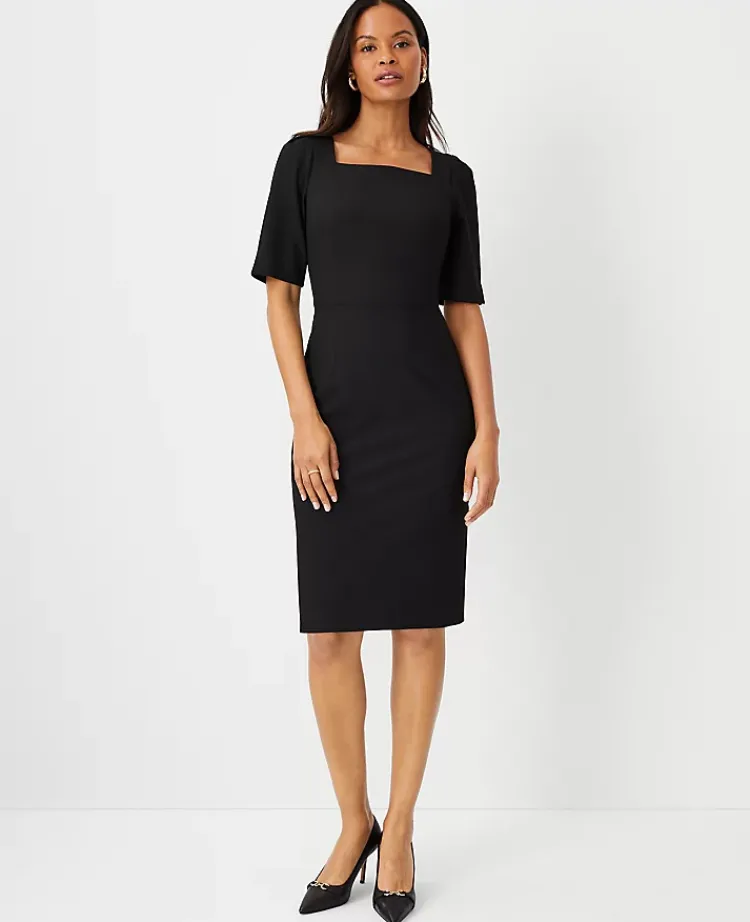 Ann Taylor Petite Dresses|Petite Suits|The Petite Elbow Sleeve Square Neck Dress In Seasonless Stretch – Curvy Fit Core Black