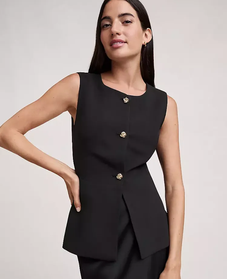 Designed for a polished, refined fit, this crew neck vest has a subtle peplum hem that gives it a chic feminine feel. Crew neck. Sleeveless. Button front.