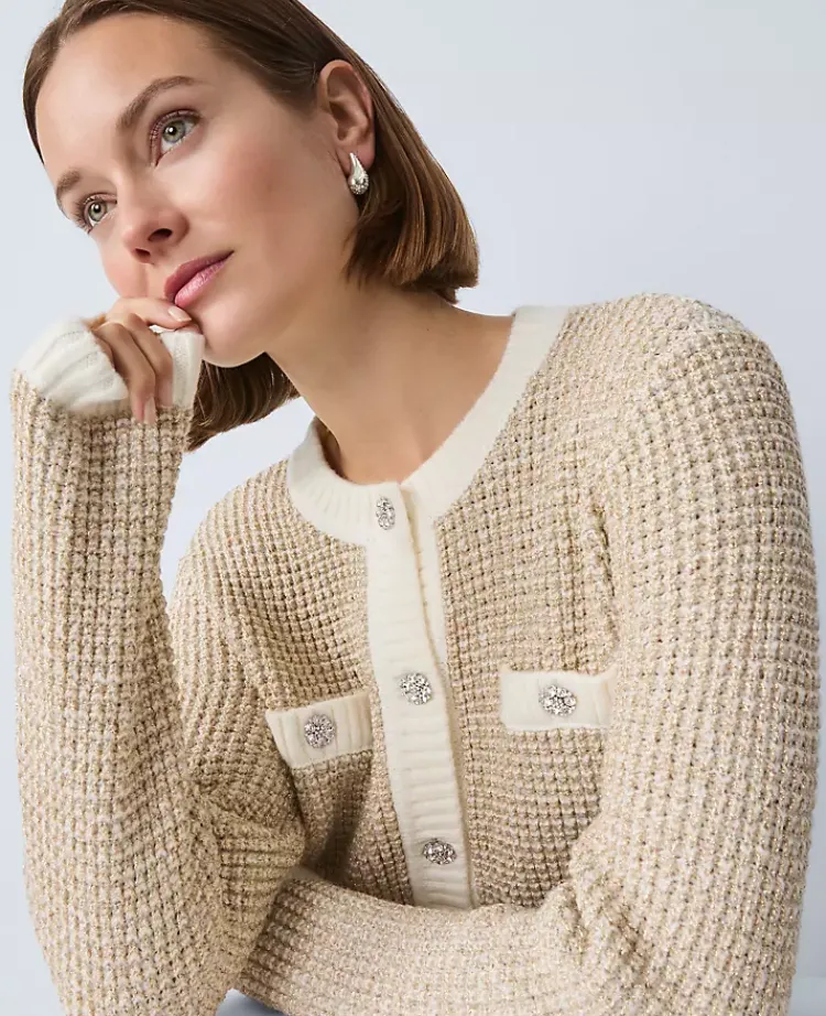Ann Taylor Petite Sweaters|Petite Metallic Waffle Knit Sweater Jacket Winter White