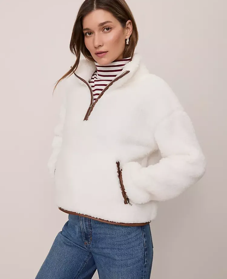 Discover Ann Taylor Weekend. Effortlessly polished pieces for wherever your plans take you. Cozy and chic, this plush sherpa pullover a modern staple with textural flair. Split neck with zip closure. Dropped shoulders. Long blouson sleeves. Welt zip pockets.