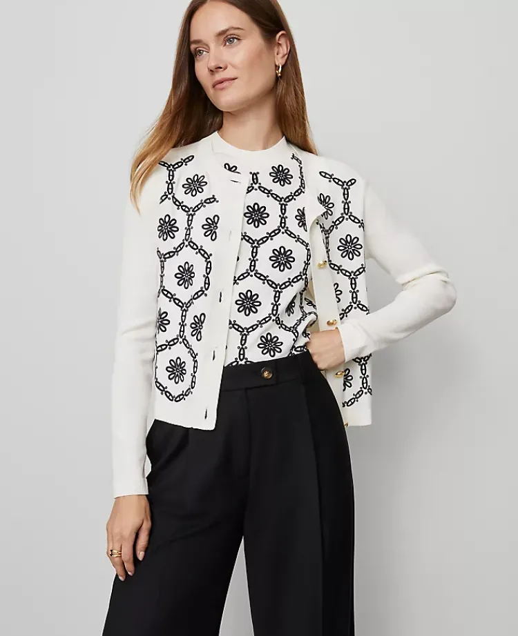Ann Taylor Sweaters|All Sweaters|Petite Floral Embroidered Cardigan White/Navy