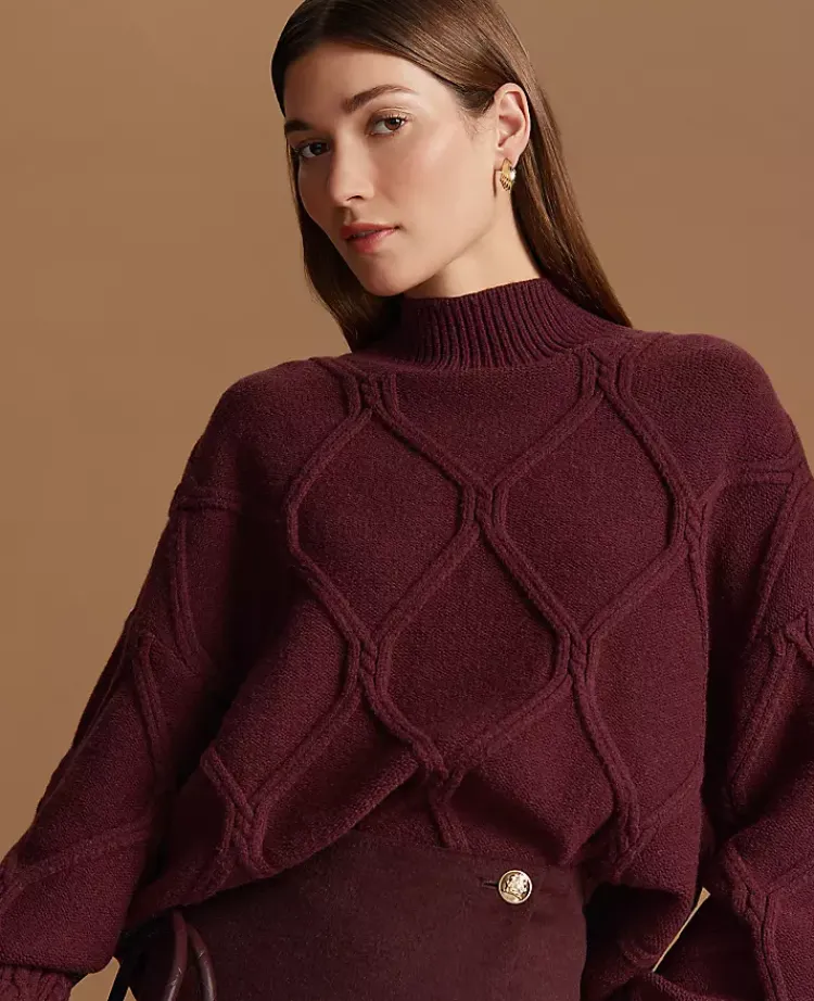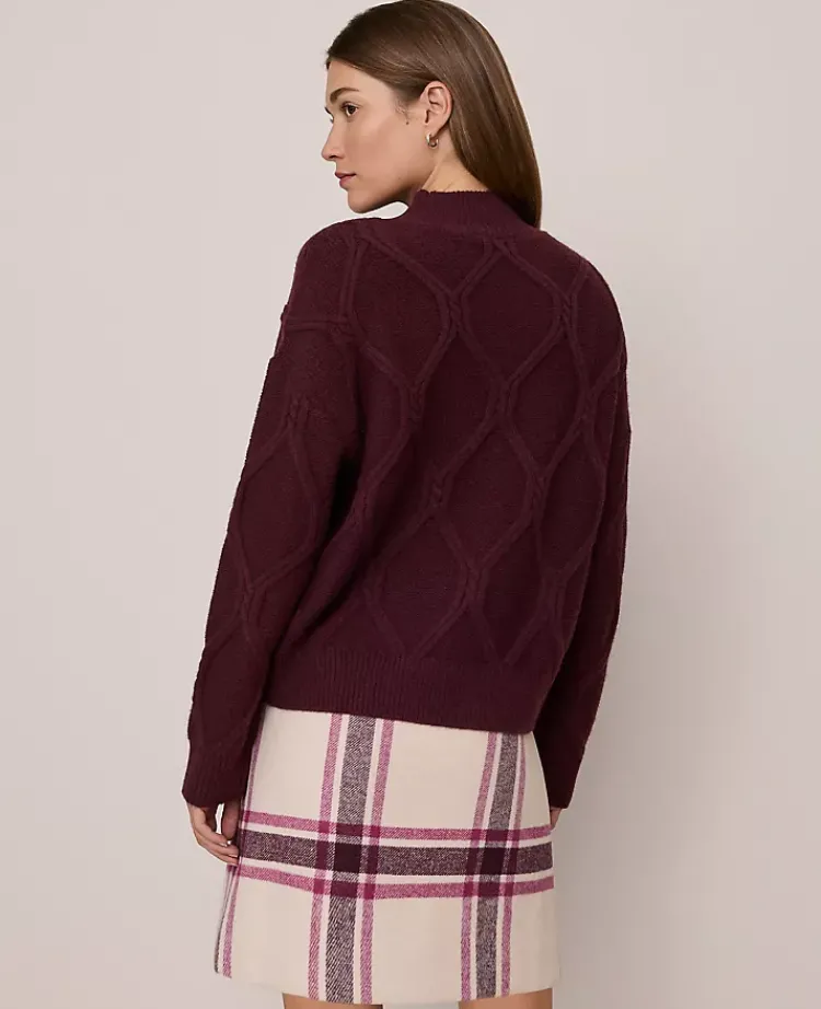 Discover Ann Taylor Weekend. Effortlessly polished, lived-in looks for wherever your plans take you. Cozy up with this plush sweater, featuring a chic and timeless diamond cable pattern. Mock neck. Long sleeves. Dropped shoulders.