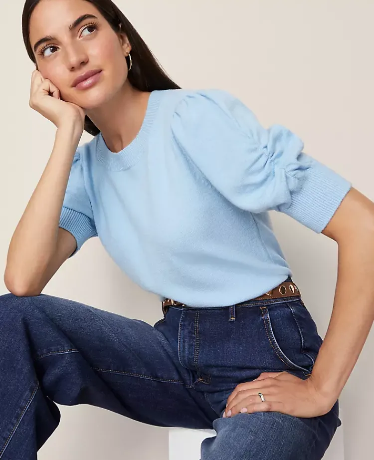 Discover Ann Taylor Weekend. Effortlessly polished pieces for wherever your plans take you. This ruched sweater tee is a versatile work-to-weekend must. Ribbed crew neck, cuffs and hem. 3/4 sleeves.