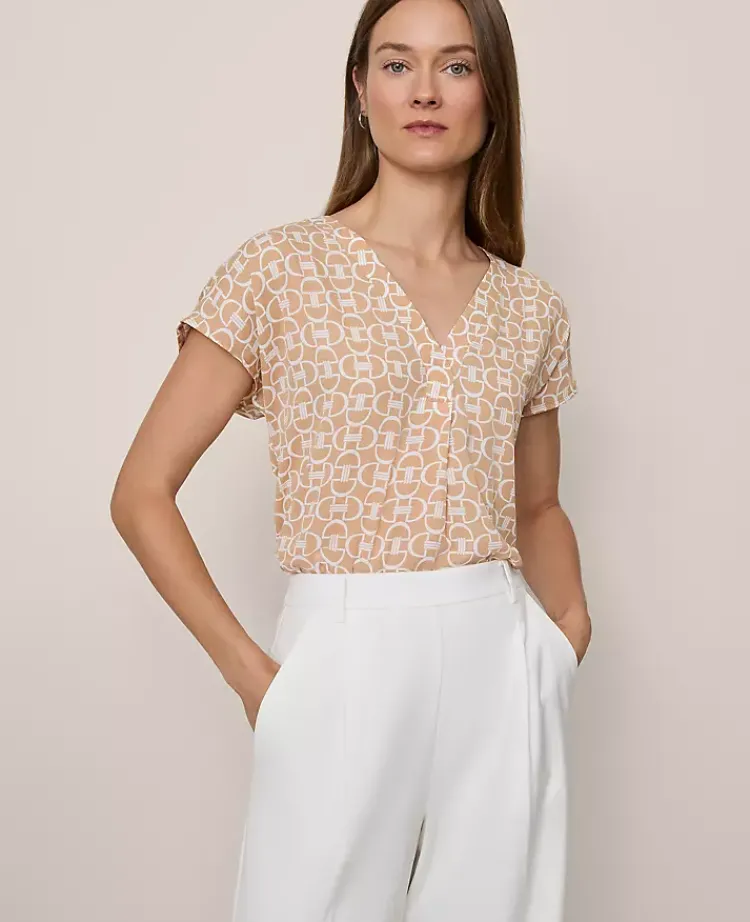A clever pleated front adds extra fluidity to this mixed knit and woven essential. V-neck with pleat beneath. Short sleeves. Woven front and sleeves. Knit back.