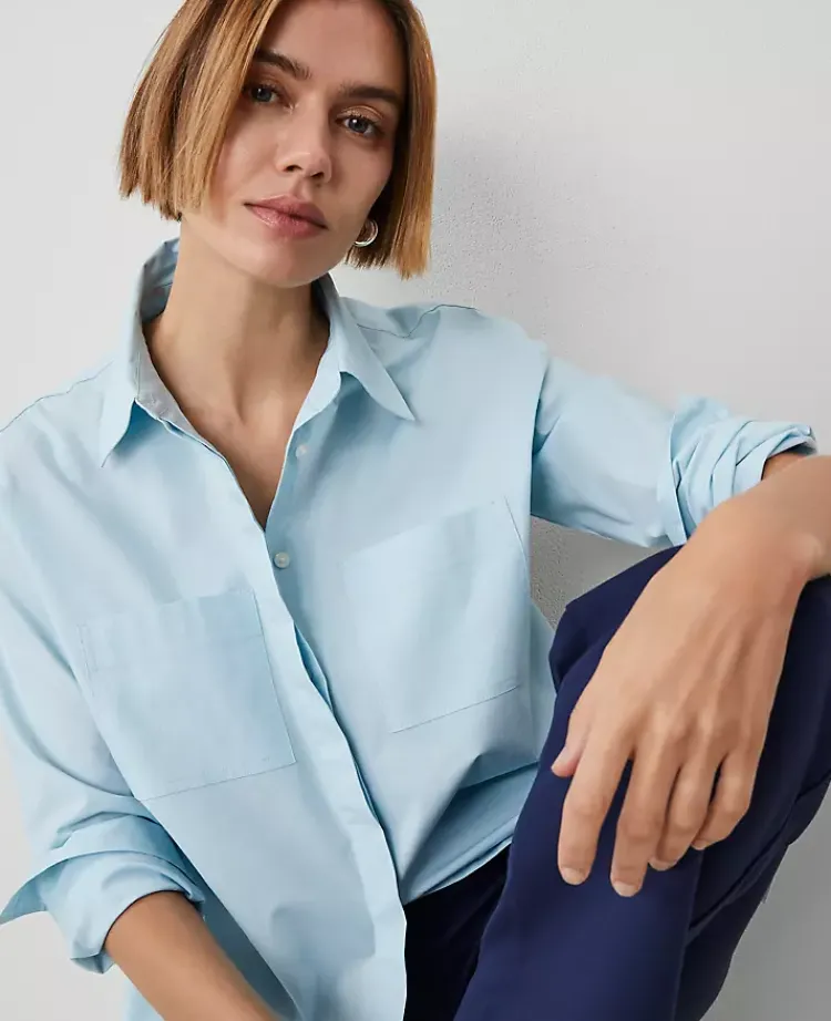Discover Ann Taylor Weekend. Effortlessly polished, lived-in looks for wherever your plans take you. Take your tailoring with a relaxed finish – this modern-minimalist tunic shirt does pulled-together style with ease. Point collar. Hidden front button placket. Dropped shoulders. Long sleeves with button cuffs. Front patch pockets. Hi-low shirttail hem.