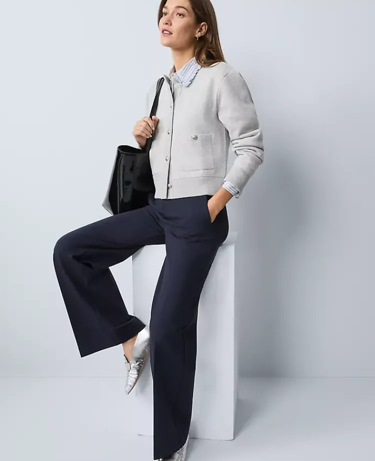Discover Ann Taylor Weekend. Effortlessly polished pieces for wherever your plans take you. Trimmed with contrasting ribbed detailing, this sophisticated jacket radiates a polished and feminine feel. Crew neck. Front button closures. Long sleeves. Front faux welt pockets.